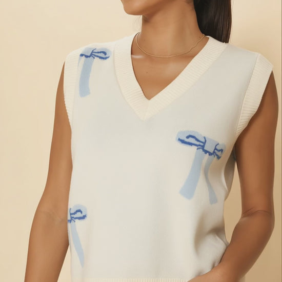 All Over Bow Knit Vest | Soft Pastel V-Neck Sweater Vest with Bow Design | Cute Feminine Layer for Every Season